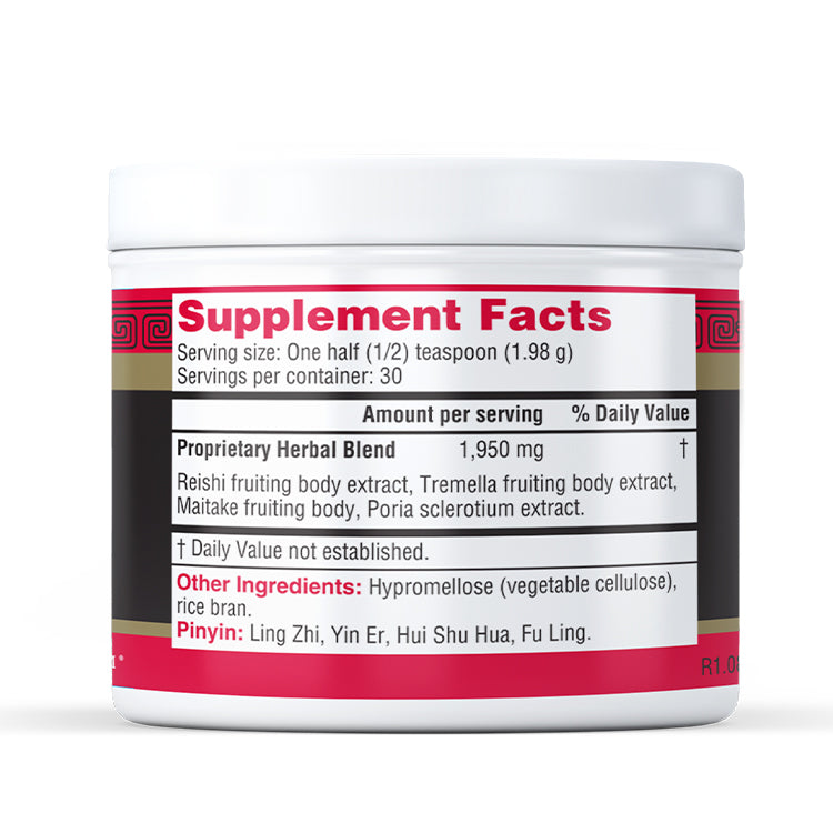 Red Ganoderma (reishi) fruiting body* (ling zhi), Tremella fruiting body* (bai mu er), Maitake fruiting body (hui shu hua), Poria sclerotium (fu ling); *extract