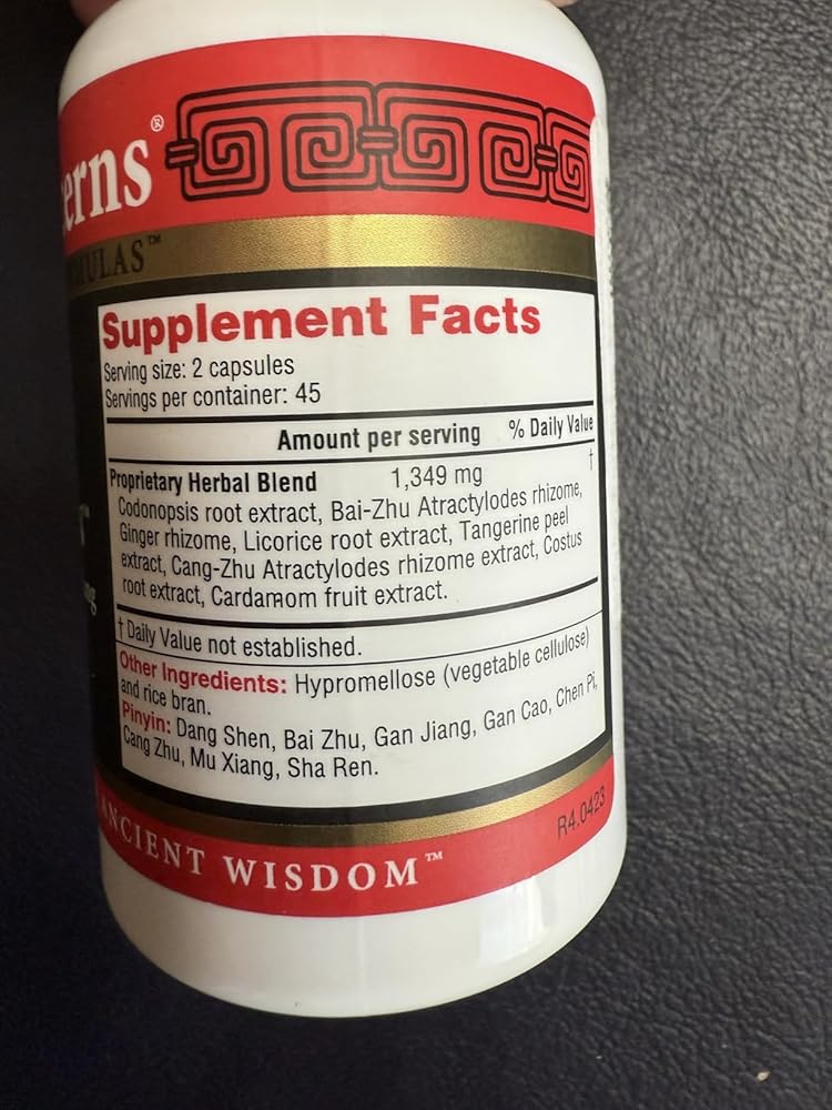 This particular blend of herbs (or very similar formulations) has been used for a very long time by Chinese practitioners and as I have appreciated the products from this company previously, I figured I would give it a try for digestion issues. I have definitely felt like my digestion has been better and I have had much less bloating since starting this formula. The capsules are easy to take and are a natural and vegan formula, which is important to me. They do have a strong scent to them, but somewhat pleasant in an herbal way and they do not leave any aftertaste that I have experienced.My one gripe is that the recommended serving size is two capsules, three times a day (six a day total). In a 90-capsule bottle, this gives you 15 days of dosage, not the 45 servings that it specifically claims in the listing. I have noted this to be an issue with this particular company. They do not make it clear upfront that their quoted serving size is in regard to one single dose a day, not the three times a day dose that seems to be recommended on the actual bottle for most of their products. I did dock a star for this, as I feel transparency is important and this makes the value of the supplement much less when you are getting only 1/3 of the number of days out of it that you anticipate for the price when purchasing. Overall, I do really appreciate the formulations that I have tried from this company, and I do hope that they become a bit more upfront in their listings as to how many *actual* daily servings that you can actually expect from a bottle.